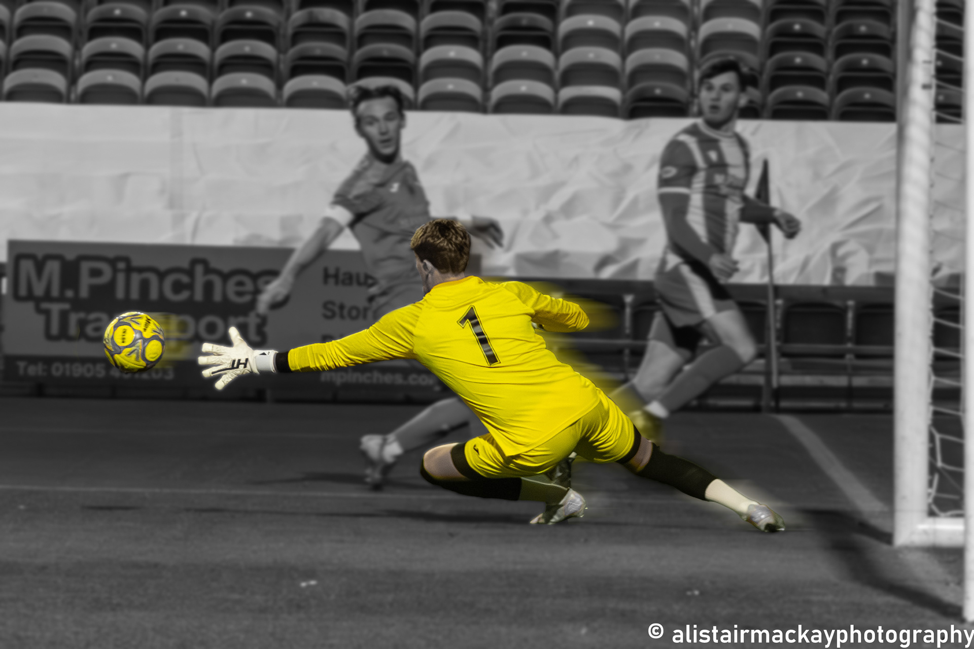 Description: I took this shot in collaboration with Pershore Town Football Club. I desaturated the background of the image whilst keeping the subject fully saturated to create a colour isolation so the client knew the main focus of the image.